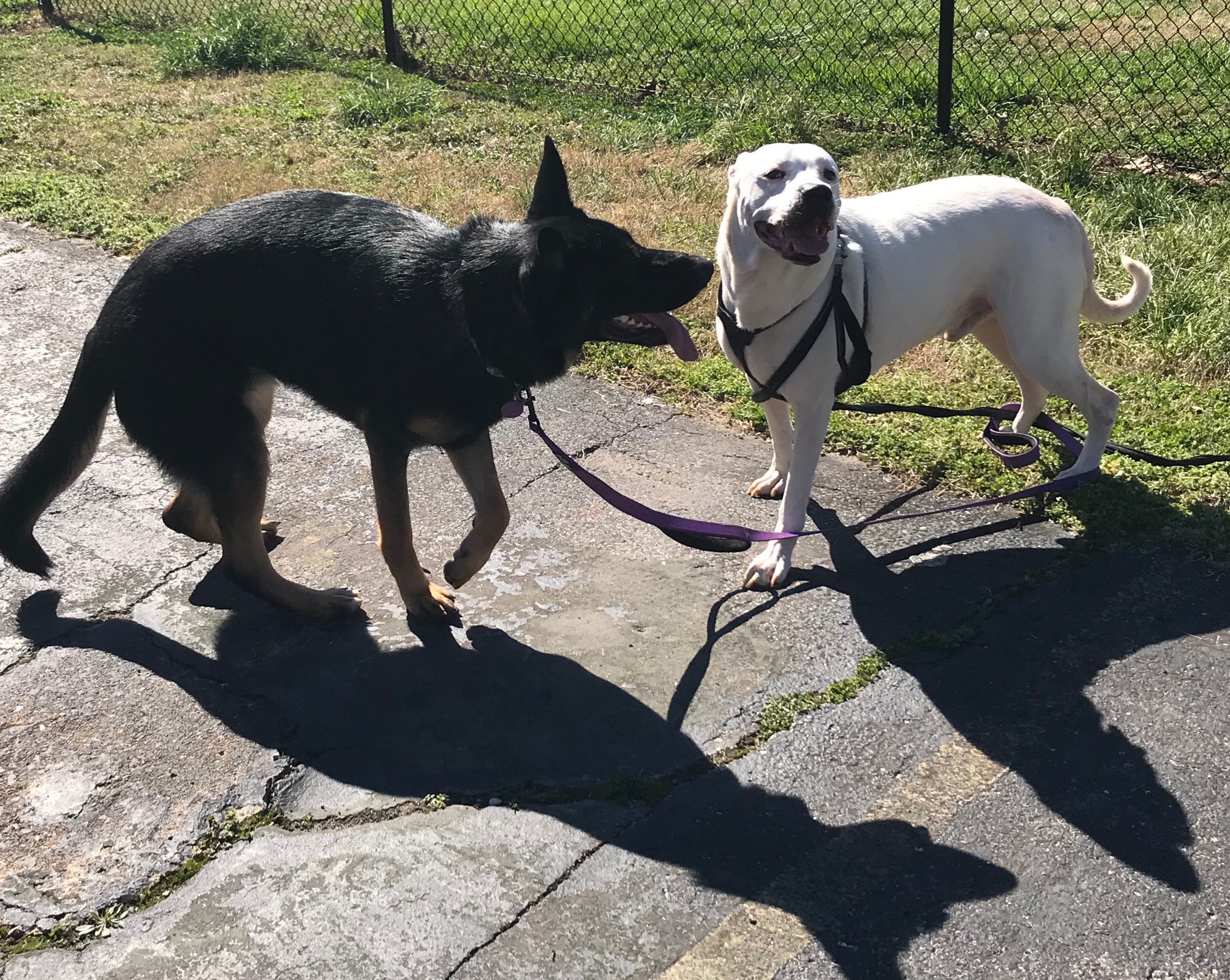 Big Bryan’s white fur shone in the mid-morning sun. The air was crisp with a gentle breeze that ruffled my curls. It was a great morning to be out for some exercise. I had taken Bryan to the fenced exercise yard in the apartment complex. My friend had come to meet me with her beautiful German shepherd, Yue. We were hoping to make a puppy play match. With two rather large dogs and the uncertainty if they would like one another, we left their leash on them. Once the dog greeting pleasantries were concluded, we were eager to initiate play.