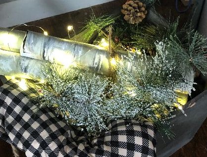 It is now mid-January and most of us have reluctantly packed up the lights and tree. I decided to leave one item of decoration out because it really was not centrally Christmas but mostly just winter-themed. Another reason I left it out was that I was pleased with it. I thought I was very clever in making it. A simple crate with a scrap of material, greenery, lights, and three birch sticks. Why was this so “clever” on my part? Because my birch wood sticks were nothing more than painted paper towel rolls. By themselves painted and tied with a bit of twine they are not very impressive and it painfully obvious what they are, but once you place all the lights and greenery around them it gives a good illusion.