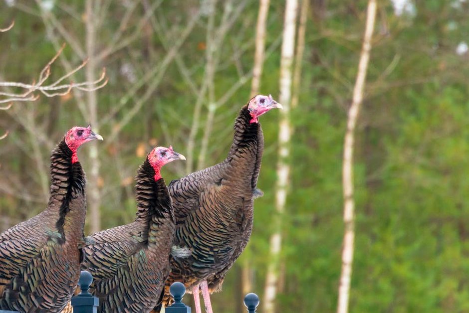 Early one morning my friend was beginning her day when she noticed that the turkeys were much louder than usual. In fact, they also seemed very close. Leaning across the table she peered out the window to see her front porch was full of turkeys. There were turkeys across the porch some on the swing, the railing, and chairs. She went to the door and stepped out. As she looked at them, they all looked up at her expectedly. Afraid that something might have gotten in their enclosure, she headed out across the yard, the rafter following. Everything was in place except the food dispensers were empty. The turkeys stood all around her watching.